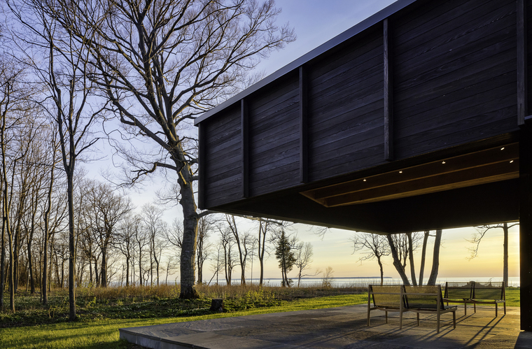 小木屋,从小木屋可以俯瞰到美丽的密歇根湖。小木屋由三种结构构建而成,用于聚集空间的结构包含了客厅、厨房、观景休息平台,而其他两个结构是用来支撑主卧和三个小孩子的卧室的。餐厅的走廊连接了这三部分结构。有着微微的起伏屋顶,随着自然地形的变化,成为附近渔民一个俏皮的参考物。