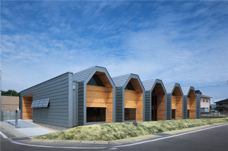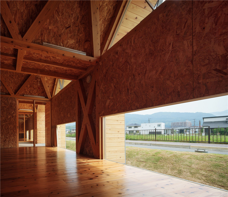 本案托儿所位于福冈市附近的太宰府市,为了容纳更多的孩子,不得不增加为两个班级??悸堑饺毡救段У某錾氏陆担痪玫慕凑饫锏暮⒆邮靠赡芑峒跎?,因此建筑师决定建造一座只有一室空间(9米跨度)的建筑,内部没有支柱,方便各种用途(游戏室等)的转换。木桁架梁在工厂安装,用拖车运送到施工现场。复杂的连接也是在工厂制作的,只有一个相对容易的连接在现场组装。这样的方式提高了施工精度,缩短了施工工期。