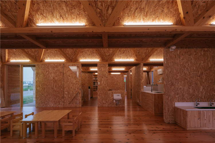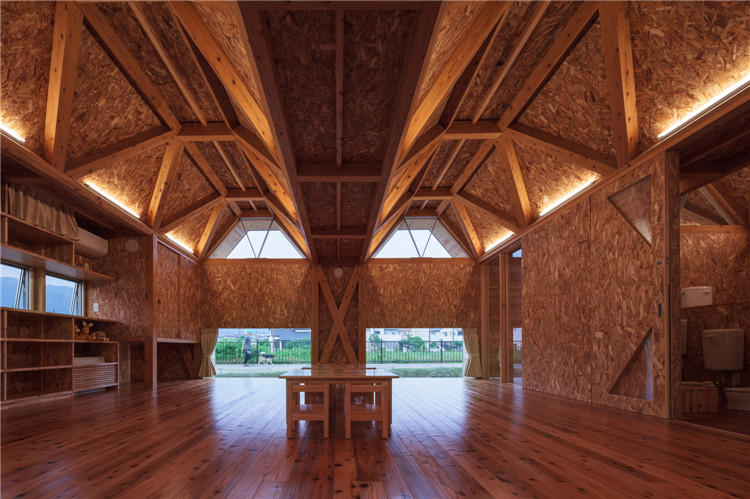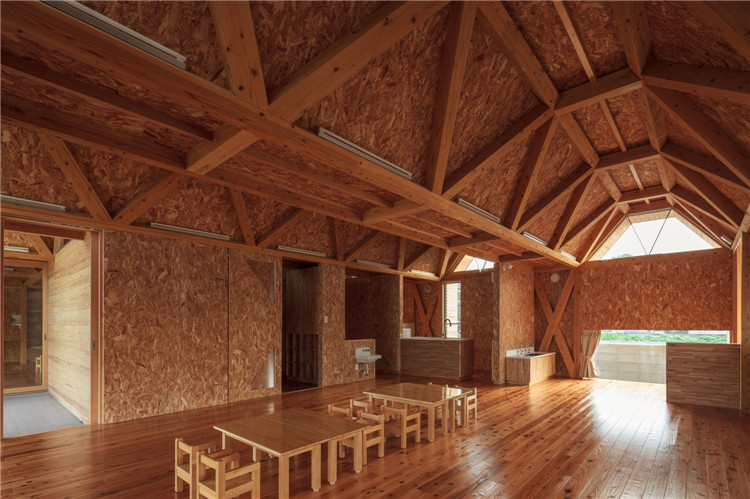 屋顶结构采用折叠板设计,无柱空间是通过运用木桁架梁屋顶结构实现的,形状像一块折叠板。所有支撑屋顶结构的承重墙都被布置在建筑外围。现在这座建筑分成了两个保育室、卫生间等,但将来也可以转换为一个大房间。
