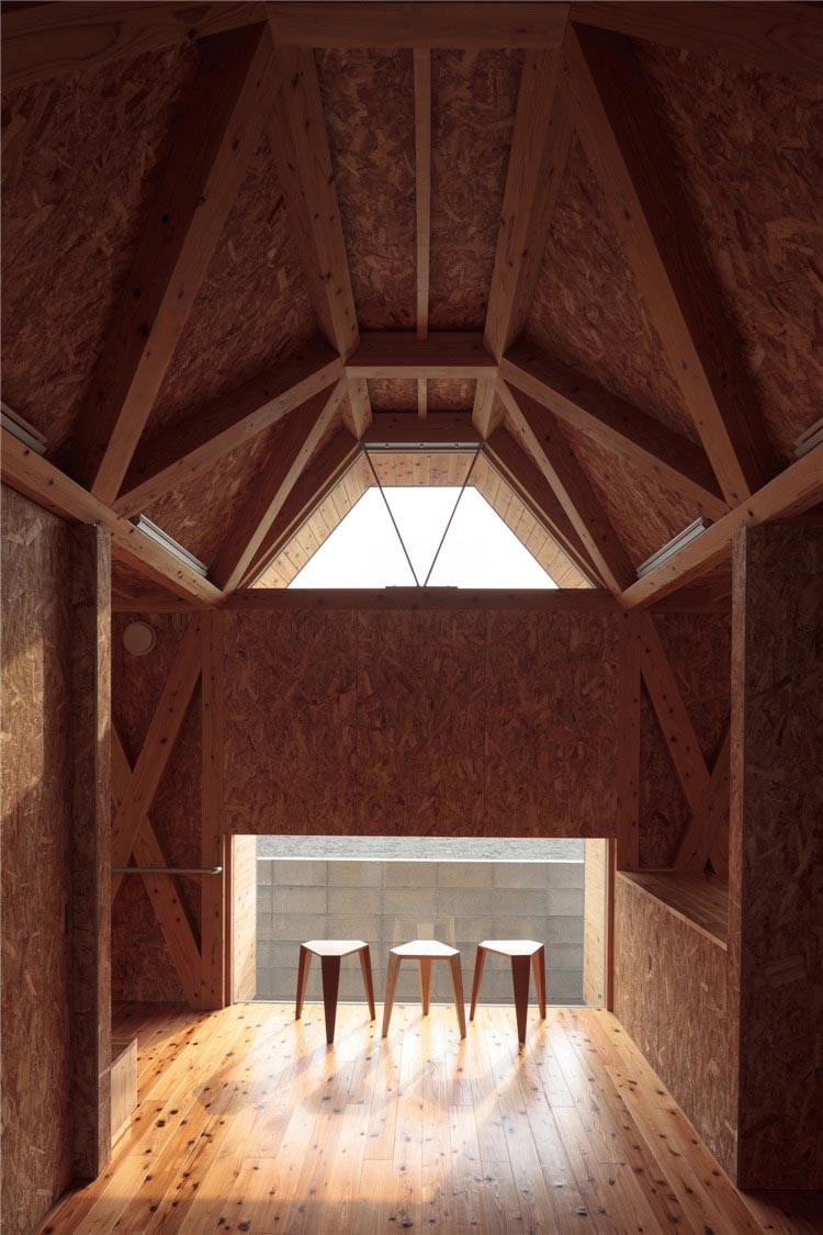 建筑的所有结构不是天花板就是墙体,木桁架梁倾斜设置,是屋顶的基础结构木构件。这样的设计满足了客户对于“保育室被木头包围”的要求,减少了建设成本。此外,通过降低天花板的高度,木材长度被缩短了,对空调的需求也降低了。由于天花板几何形状不规则且窗户为梯形,因此虽然天花板最低的地方只有2.2m左右,但即使是成年人也不会感到压抑。