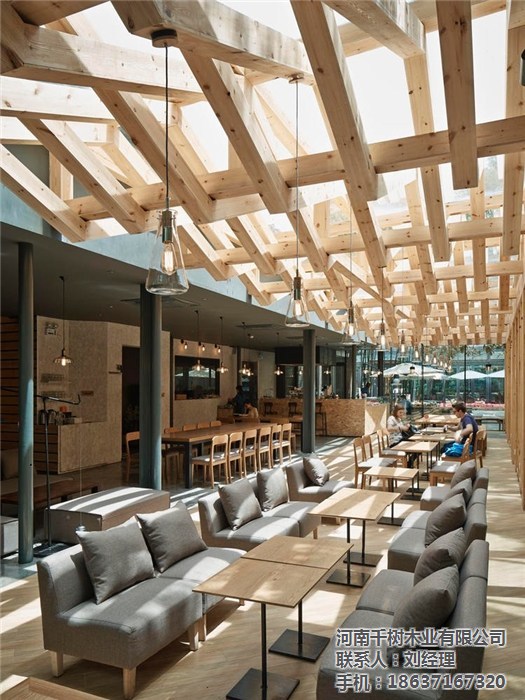 且新增的木梁在原有的钢梁结构之间交织穿梭,形成丰富有层次的光影效果,尤其是在天气晴好的时候,体验感更为直接。对于空间区域的分割,设计团队也着手从天花板部分来创造。比如前述提到的主要的编织木梁结构,其下方的空间宽敞明亮,更适合于那些喜爱沐浴在阳光或自然天光之下的客人们。而靠近建筑内部的空间,在灰黑色的天花板映衬之下,则要显得沉稳、私密一些,显然更适合那些需要安静空间的客人们。