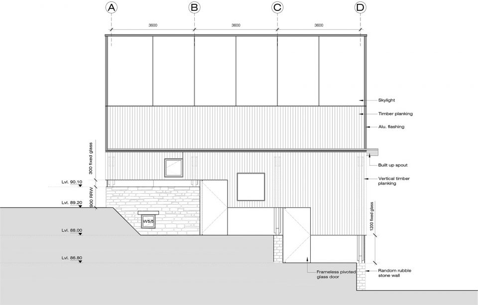 空间由三个不同的层次组成,每一个都大约占用14.5米x3.6 m的自然地形,外立面的连续横窗使得周围的果园和Almora镇的壮观景色一览无余。这个开窗像是一个裂缝,成为现场挖出的裸露的干石墙基地和当地名为thun木材包覆之间的过渡。