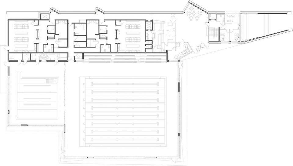 ▼主入口、接待处、更衣室和游泳池皆位于建筑的主楼层