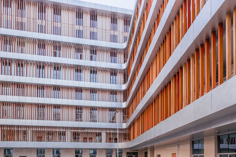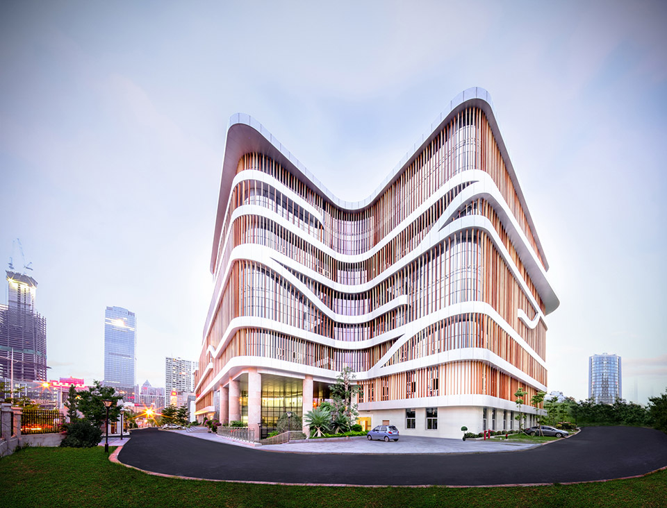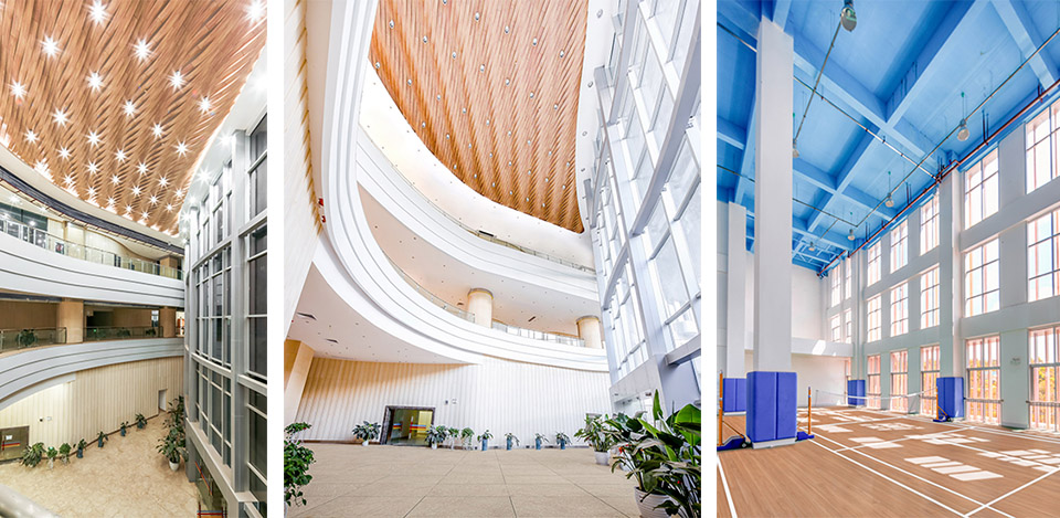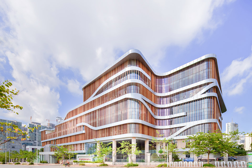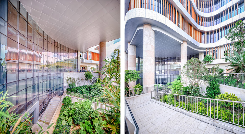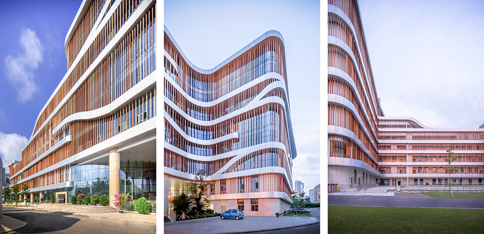 时境建筑的广西老干部活动中心项目结合地貌的变化,尝试将本地传统的竹木结构建筑原型通过当代技术转译为现代空间,变化的遮阳板肌理暗合了本土手工印象,创造了丰富的室内与室外的空间体验。