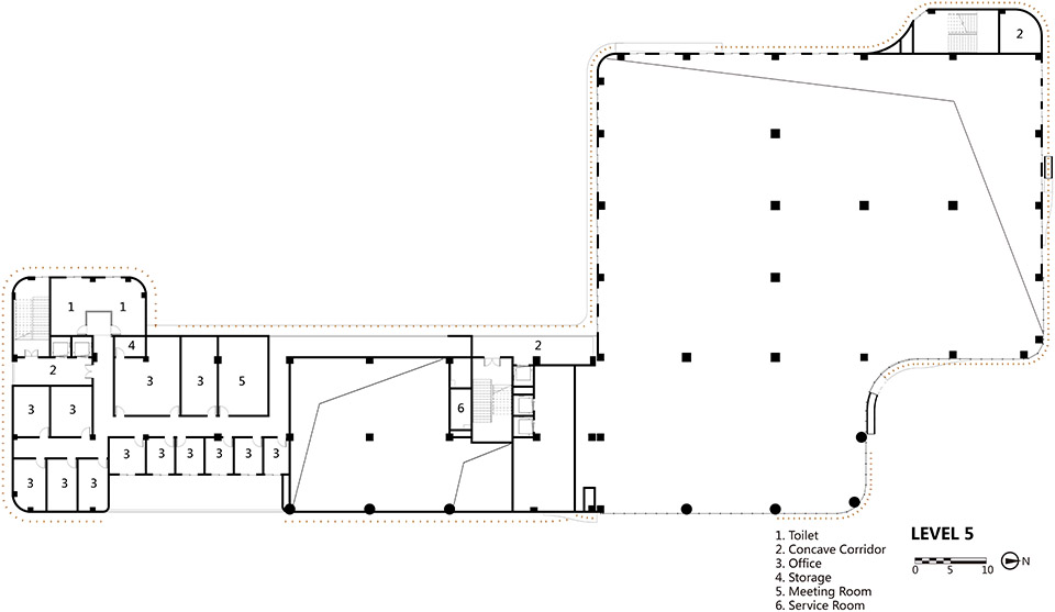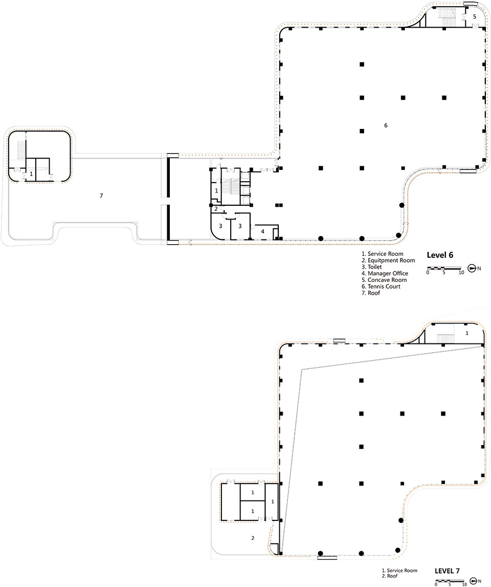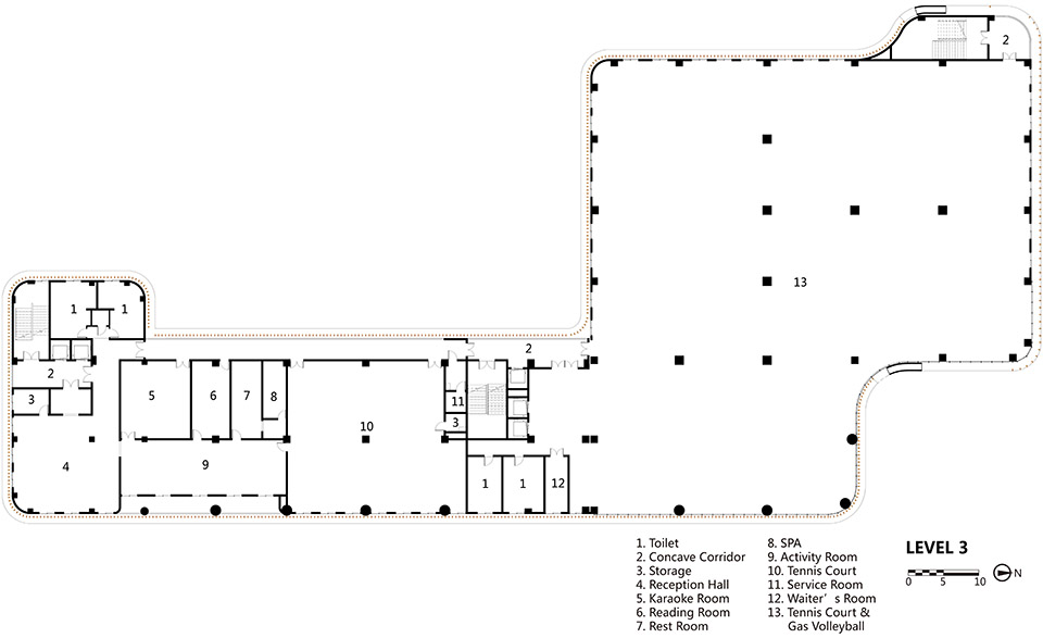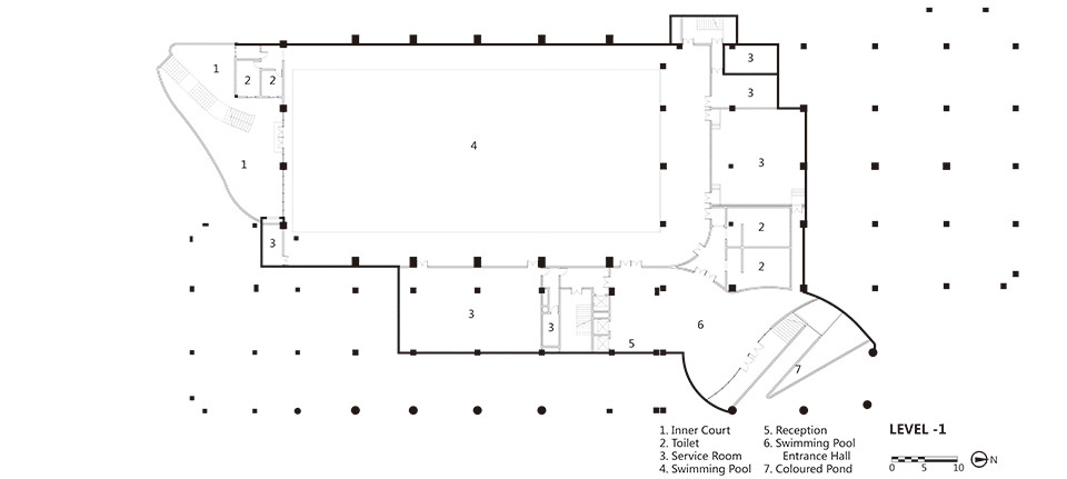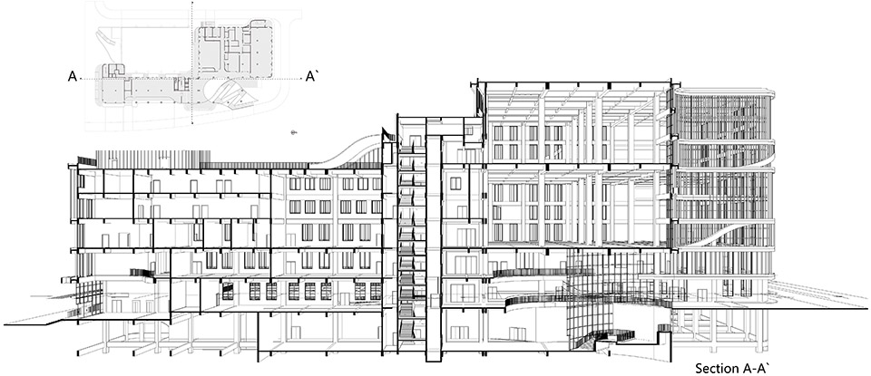 我们希望通过这个项目唤起我们的父辈及下一代的归宿感。农业生产是那个时代“集体式生活”的标志,自然地貌便是这一代人集体记忆的背景。我们通过对建筑空间在“地面”层面上的叠加,再现了自然地貌:在城市层面上,由于本项目地处城市扩张的边界,位于较低的洼地地形,面邻一个保留的绿化高地,我们在建筑手法上引入一系列上下错开的水平楼板来使这两种极端的地貌形成空间上的对话;在建筑尺度,我们转译了这种拓扑关系为一种多层楼板的空间类型,例如地下室空间转折到首层入口层,接着又垂直延伸到二层空间,并不断交错向上;在细部层面,我们使用了木纹铝方通遮阳板系统将丰富的地景引入到室内,是对本土的竹材结构建筑形制所做出的回应。