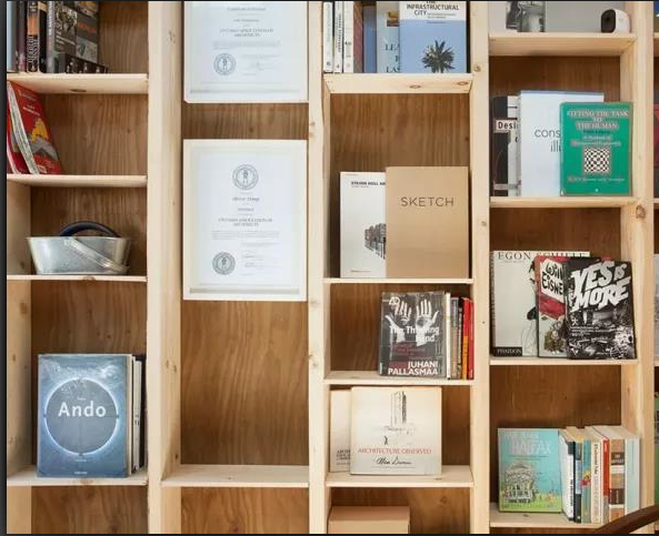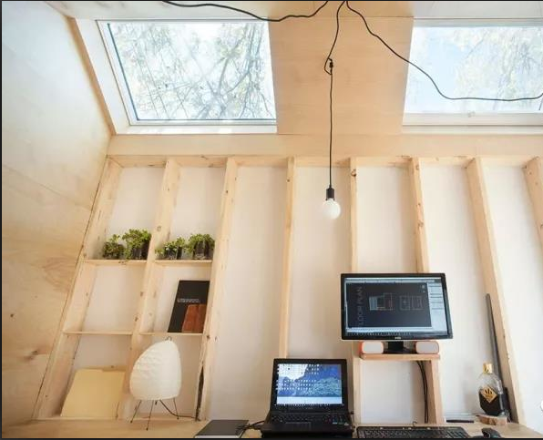 在内部,设计师团队需要利用每一寸可用的空间。垂直螺柱裸露在外,并作为支架支撑,以及由桦木胶合板制成的更大的水平表面的锚。