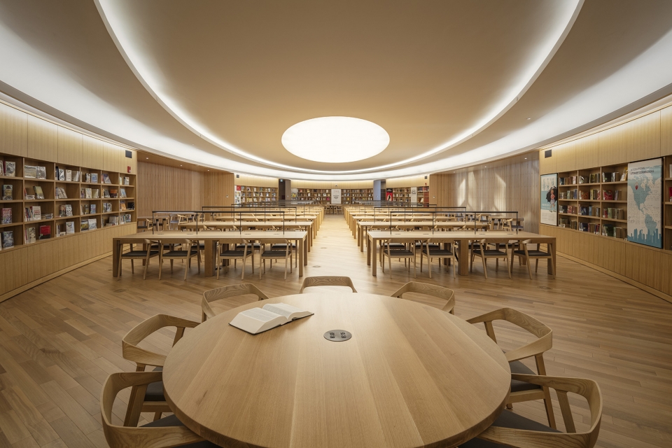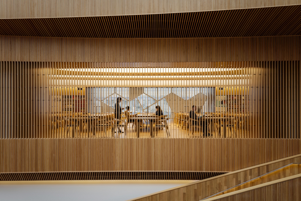 图书馆共有六层,分布着各种空间,比如数字空间,模拟空间,群体空间以及个人互动空间。图书馆顶层是大阅览室,建筑师在设计时,把它构想成藏在图书馆的珠宝盒,人们可以在这儿潜心研究,寻找灵感。进入大阅览室之前要先经过一个过渡空间,过渡空间光线柔和,声效优良。室内利用木质格栅而非实体墙壁来环绕空间,这样既保证了隐私,又有一定的可见度。阳光透过木条的缝隙照亮了中庭和西立面之间的空间。