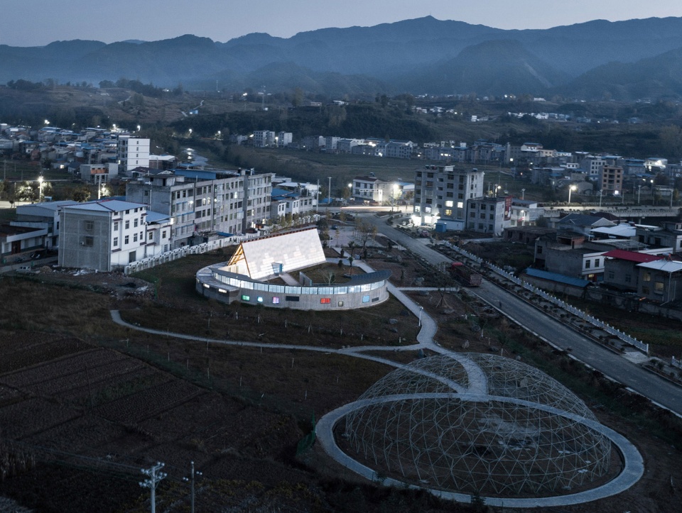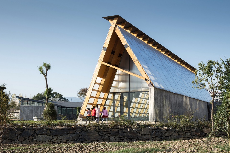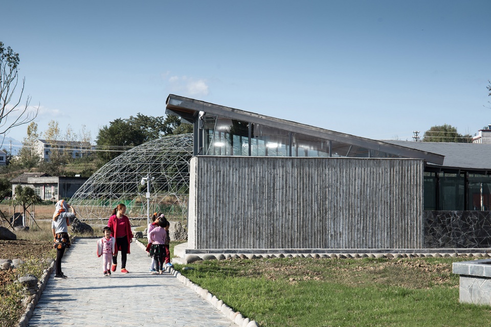 建筑需要面对新的长龙大道,也需要对新老路的转角空间进行回应。墙体遇到亲子活动的部分,折叠成弧形空间,包裹出其所需的室内外场所;而在接待的部分,墙体则流动成线性空间,如巷道般通向村口,作为视觉和功能的导引,其正面又刚好围合出面对长龙大道的入口场地,同时,巷道的另一个出入口也自然融入到亲子活动的路径上。