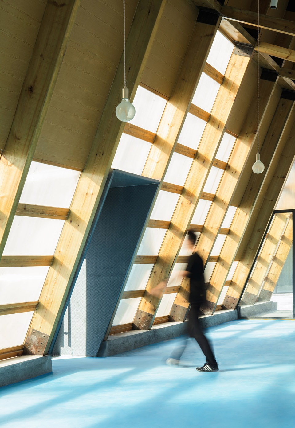 直线空间采用木结构形成交叉的构件,中间用斜撑连接,顶部利用交叉形成的平面,盖上钢板作为防水构造的一部分,木结构外采用阳光板覆盖,使光线柔和进入室内,而内部则根据西向的日照分析曲线嵌入高低错落的木板以减少顶部的阳光辐射。