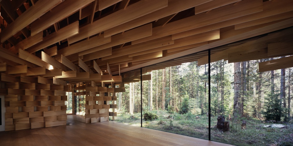 该建筑以生长在场地附近的冷杉树为主要材料,3厘米宽的木板像树枝一样堆叠起来,在广阔的森林和精致的建筑间形成一种柔和的过渡。小屋同样也充当了使人融入森林的媒介。阳光透过枝叶间的缝隙从天窗透进室内,带来森林中常??梢蕴逖榈降?ldquo;komorebi”(木漏れ日)般的效果。