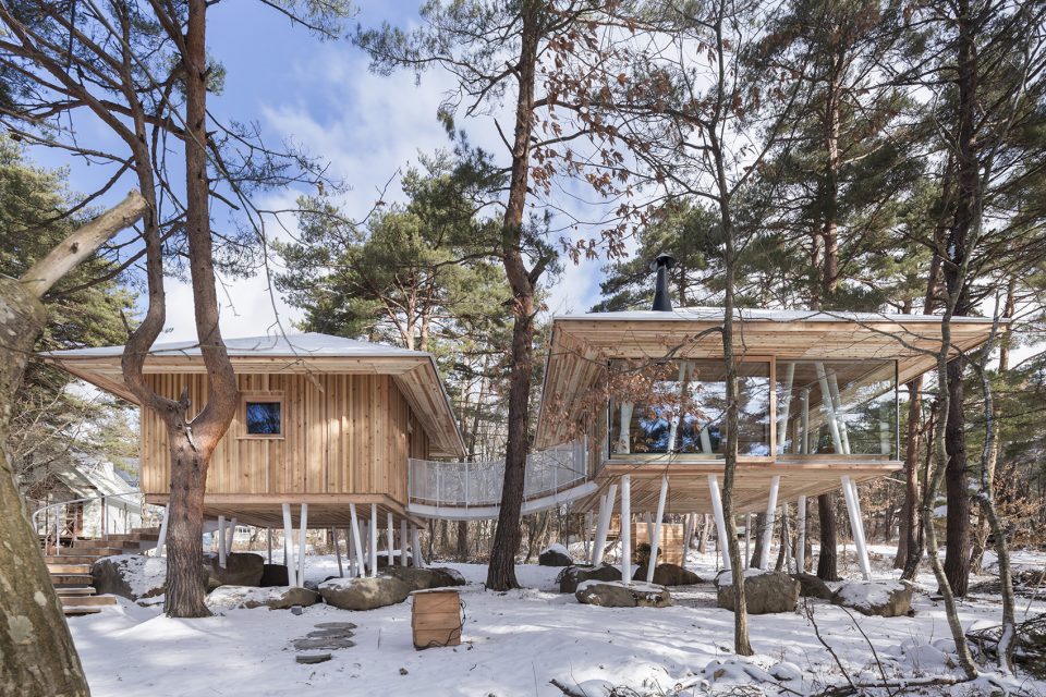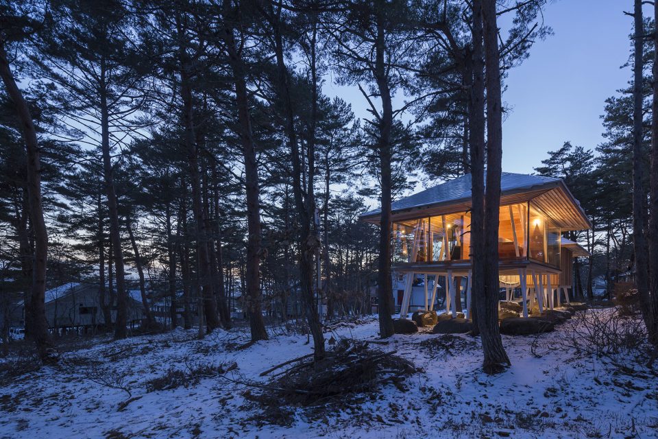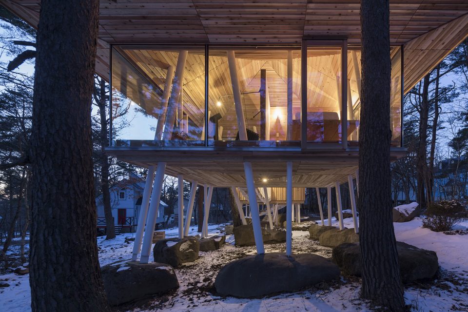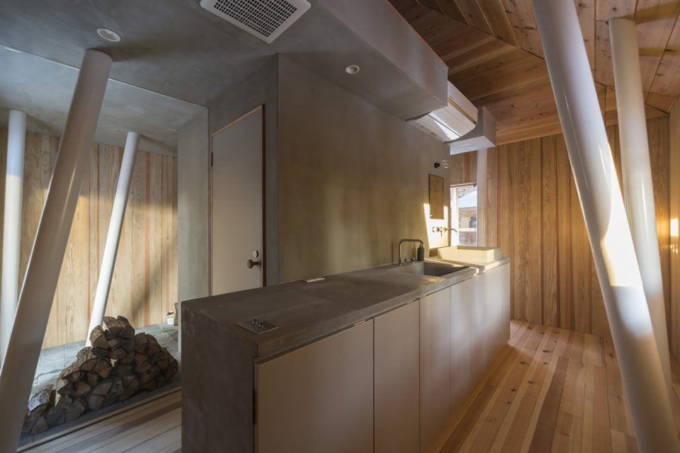 该地区常遇大雪天气,因此建筑师利用架高的结构为建筑赋予了2米多的雪荷载,以保证房屋不受大雪的破坏。住宅拥有两个体量,分别容纳了起居功能和生活用水功能。这两个体量通过一座桥形成连接,使居住者能够在桥上充分享受自然环境带来的感官刺激。
