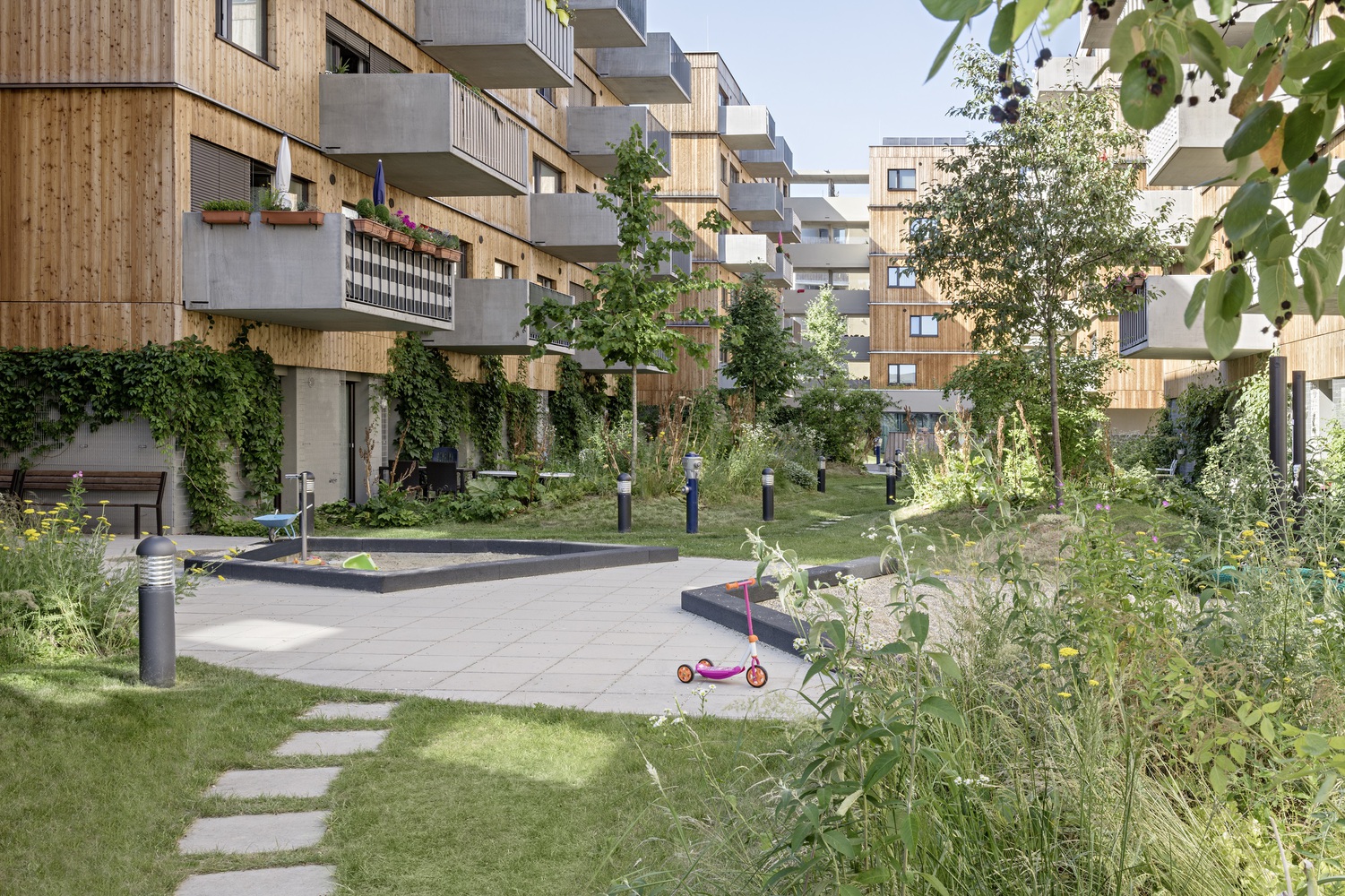 绿色的庭院与一些长满青草的小山丘一起,形成了一个有机的景观,这些庭院的翼形梯田有意地凸显在中央庭院的中间。山丘、树木和带小树冠的灌木遮挡了私人露台。通往丘陵景观的道路网络被刻意限制,以防止走廊式路线的发展。在入口区、洗衣房和儿童游乐场前的路口形成了聚会场所。