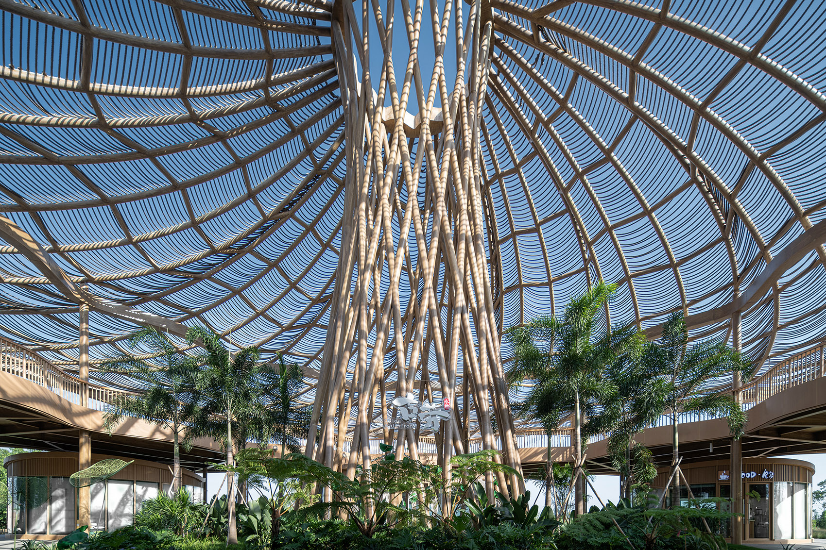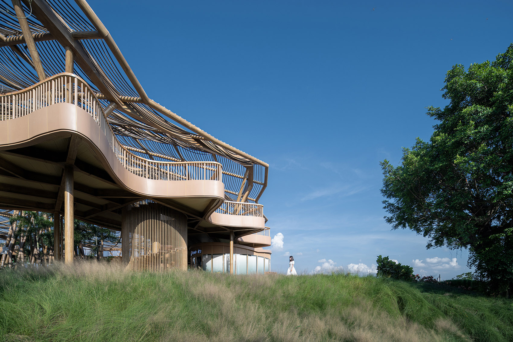 屋顶采用当地天然材料麻绳遮阳,在保证了整体建筑完整性的同时,将地域生态的材料用现代悬挂的形式呈现,提升了屋顶观览区的观赏性,使整个建筑也成为了一道靓丽的风景线。