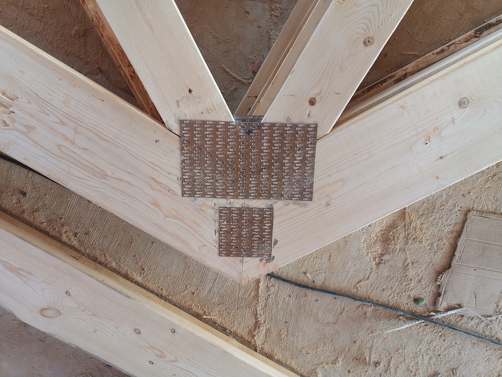 齿板连接主要用于轻型木结构建筑中规格材制成的轻型木桁架节点连接。轻型木桁架是北美轻型木结构体系中屋架体系的主要结构形式。其特点是支撑形式灵活,桁架间距较密,通常小于600 mm。在桁架连接处应用齿板,可以较快的进行桁架中各弦的定位。即在工厂中拼装好一品桁架后,将桁架平放,同时用专门的压力机将齿板直接压入桁架中各条弦之间的连接处。齿板连接其最大的优点是提高了施工效率,保持了木材的完整性。同时齿板作为连接件,与木材之间表现较好的协同作用,塑性性能良好。