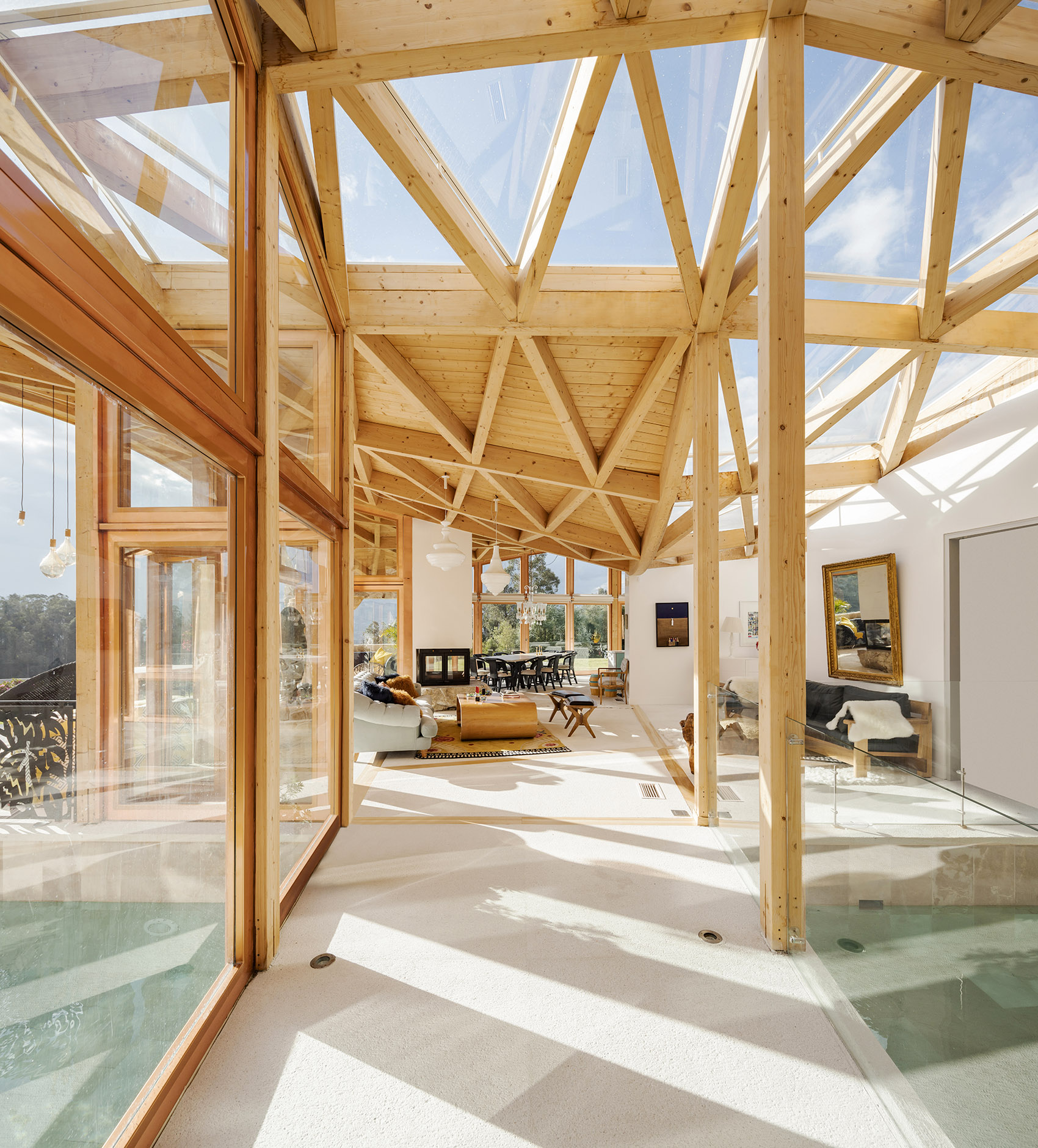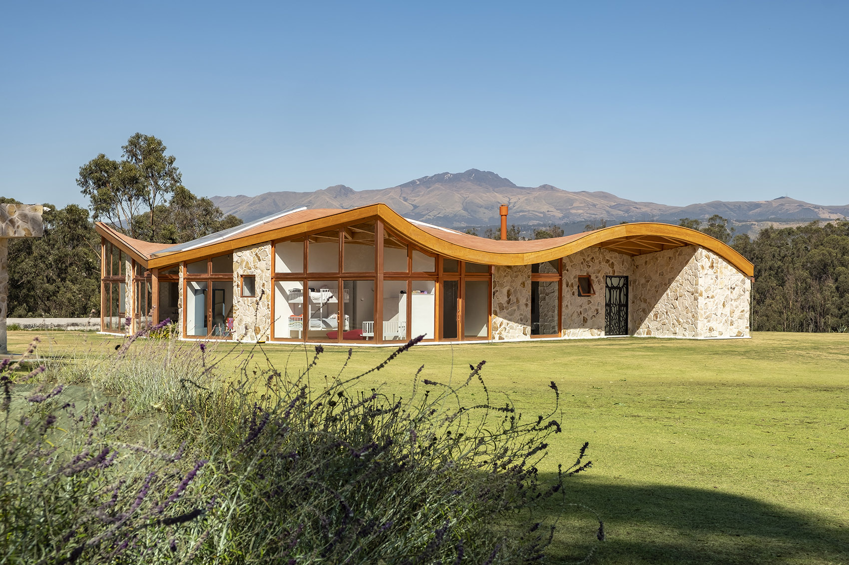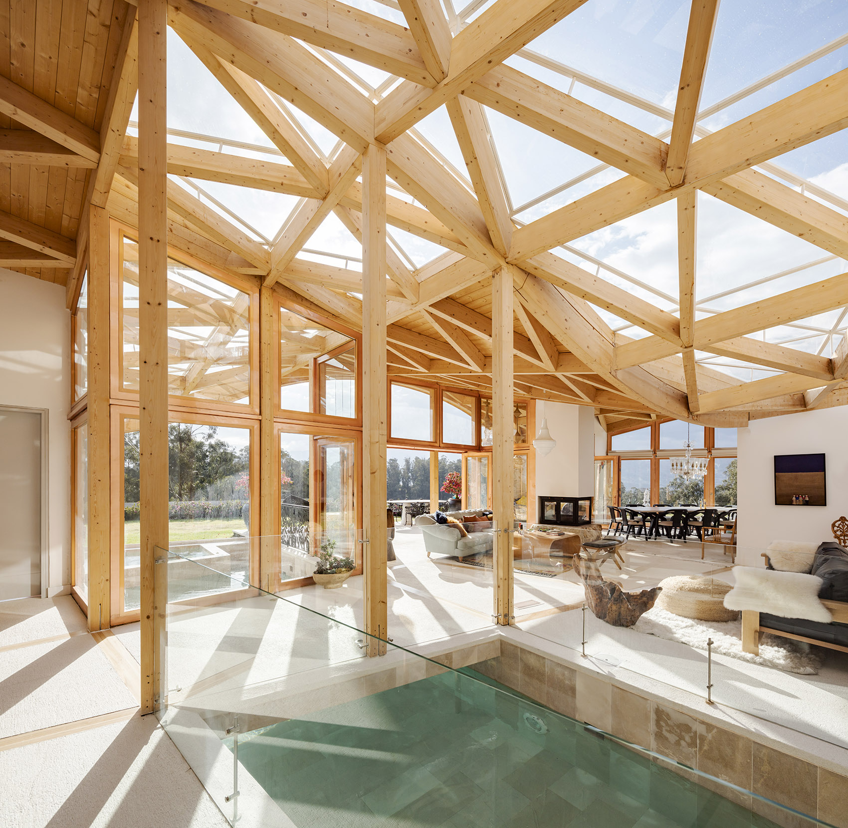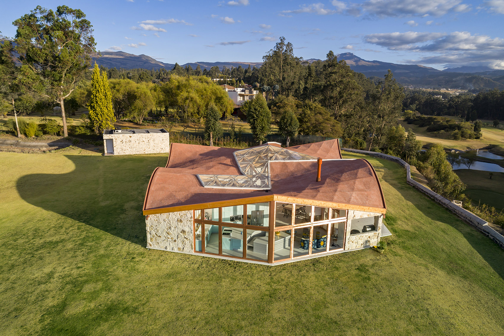 落成后的住宅呈现出石材与玻璃的微妙平衡,充满活力与温暖的木结构外观则将建筑与环境融为一体。室内设计遵循了最初的概念,以精致的材料与现代化的设计,平衡并激活了建筑空间。从利用先进的制造工艺处理木材,再到结合本地和国际建造经验,本项目向大众展示出本地工业的巨大潜力。这是厄瓜多尔首次实现该类型的建筑,并达到如此细致的水平。将数字技术与当地的手工劳动技术相结合,不仅创造出独特的建筑形式,同时也有助于提升该国建造业的潜力与可能性。