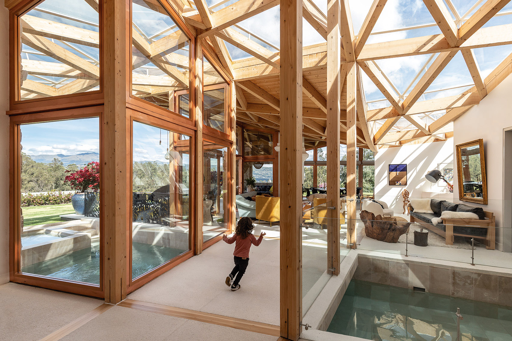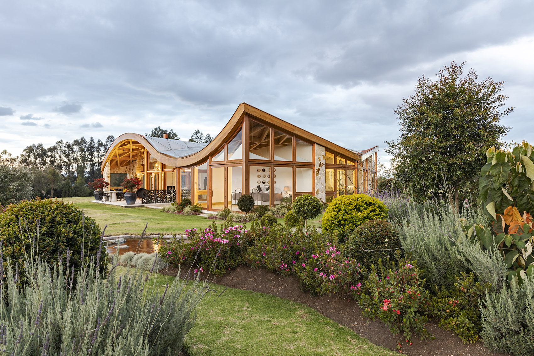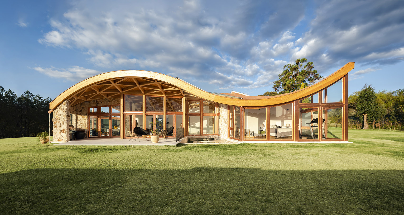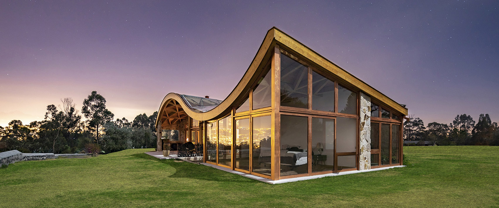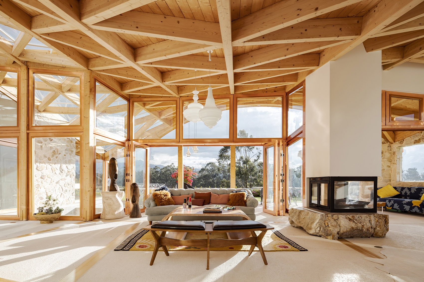 落成后的住宅呈现出石材与玻璃的微妙平衡,充满活力与温暖的木结构外观则将建筑与环境融为一体。室内设计遵循了最初的概念,以精致的材料与现代化的设计,平衡并激活了建筑空间。从利用先进的制造工艺处理木材,再到结合本地和国际建造经验,本项目向大众展示出本地工业的巨大潜力。这是厄瓜多尔首次实现该类型的建筑,并达到如此细致的水平。将数字技术与当地的手工劳动技术相结合,不仅创造出独特的建筑形式,同时也有助于提升该国建造业的潜力与可能性。