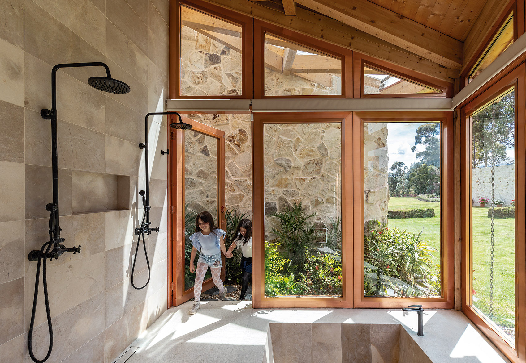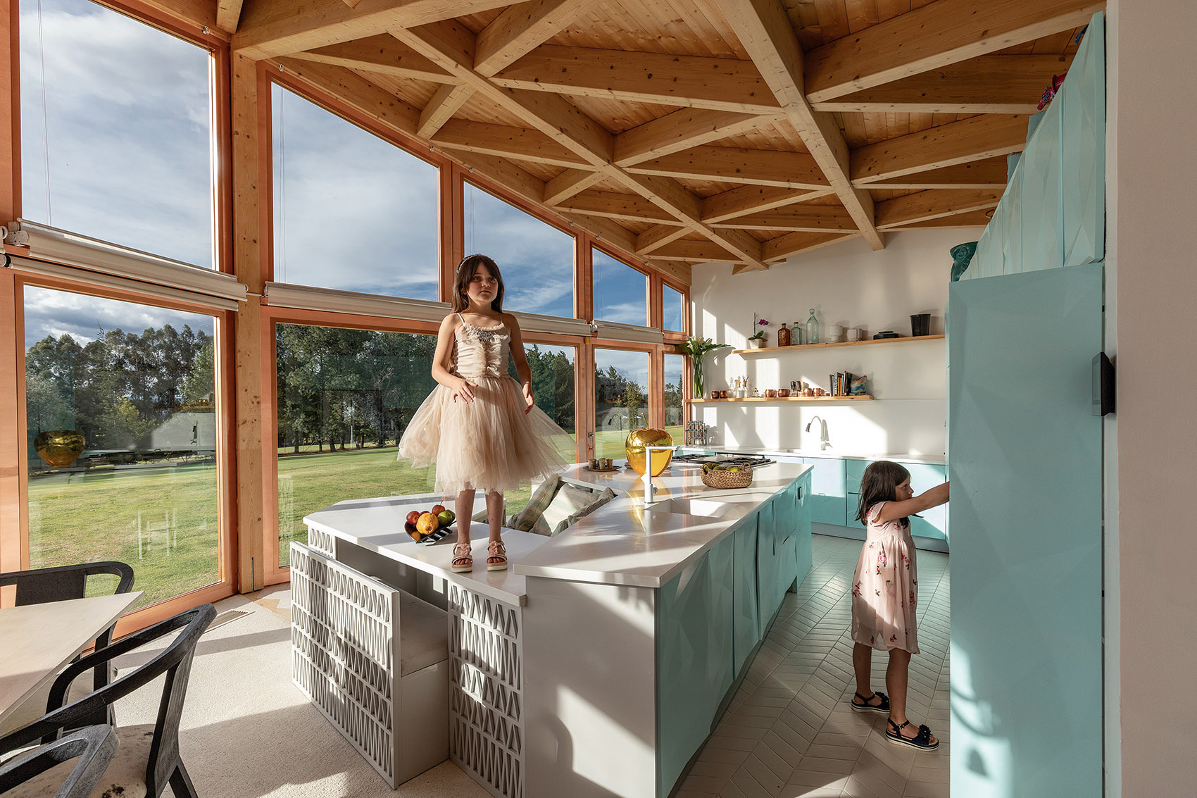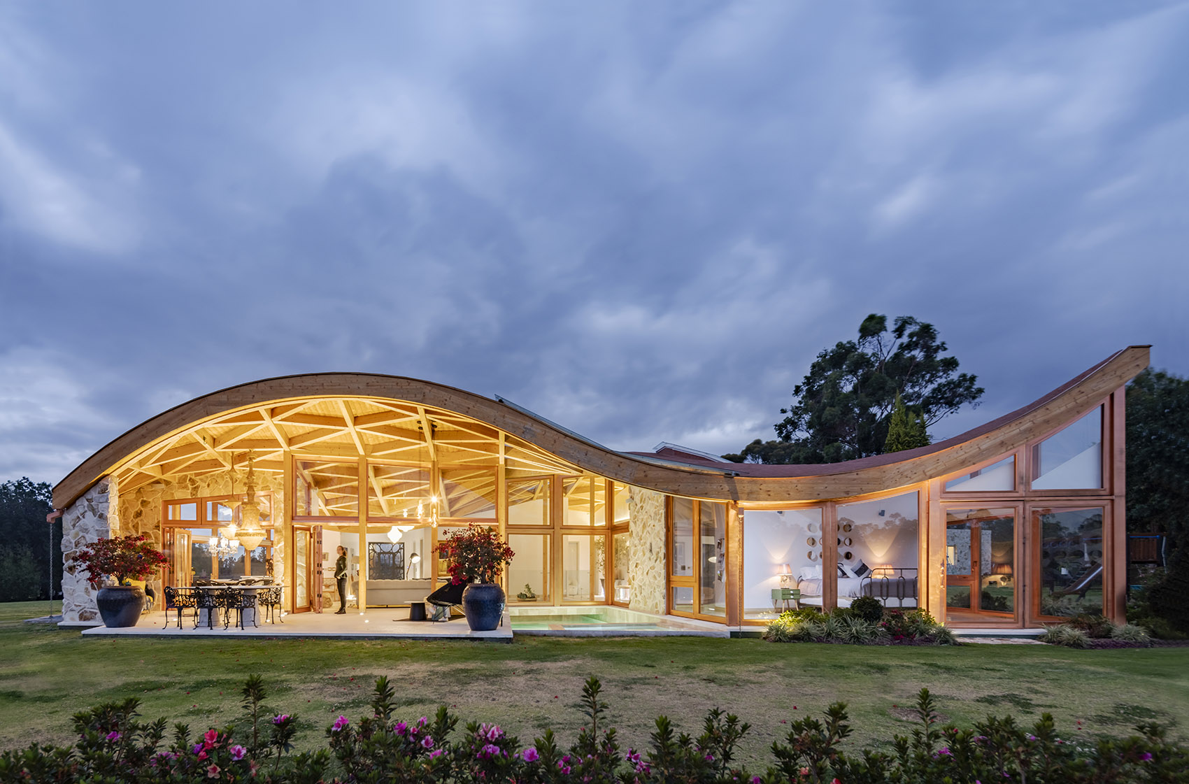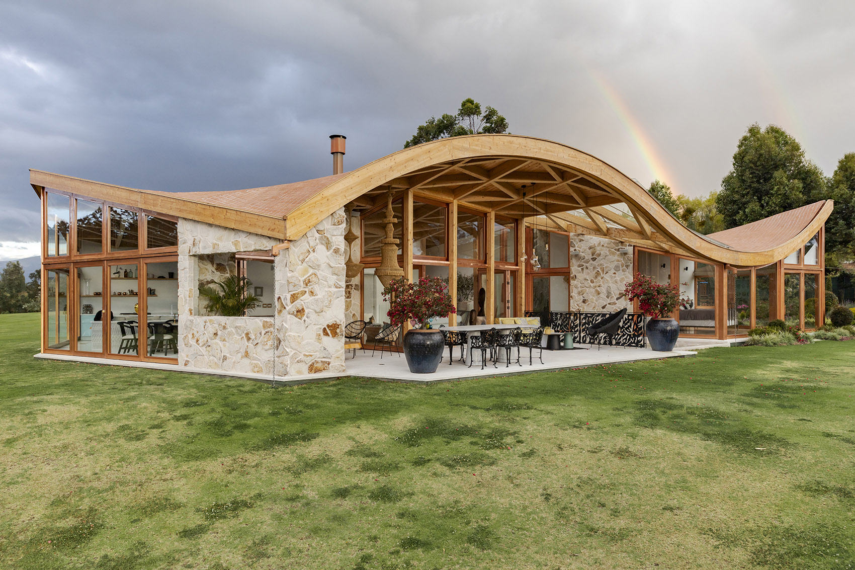 落成后的住宅呈现出石材与玻璃的微妙平衡,充满活力与温暖的木结构外观则将建筑与环境融为一体。室内设计遵循了最初的概念,以精致的材料与现代化的设计,平衡并激活了建筑空间。从利用先进的制造工艺处理木材,再到结合本地和国际建造经验,本项目向大众展示出本地工业的巨大潜力。这是厄瓜多尔首次实现该类型的建筑,并达到如此细致的水平。将数字技术与当地的手工劳动技术相结合,不仅创造出独特的建筑形式,同时也有助于提升该国建造业的潜力与可能性。