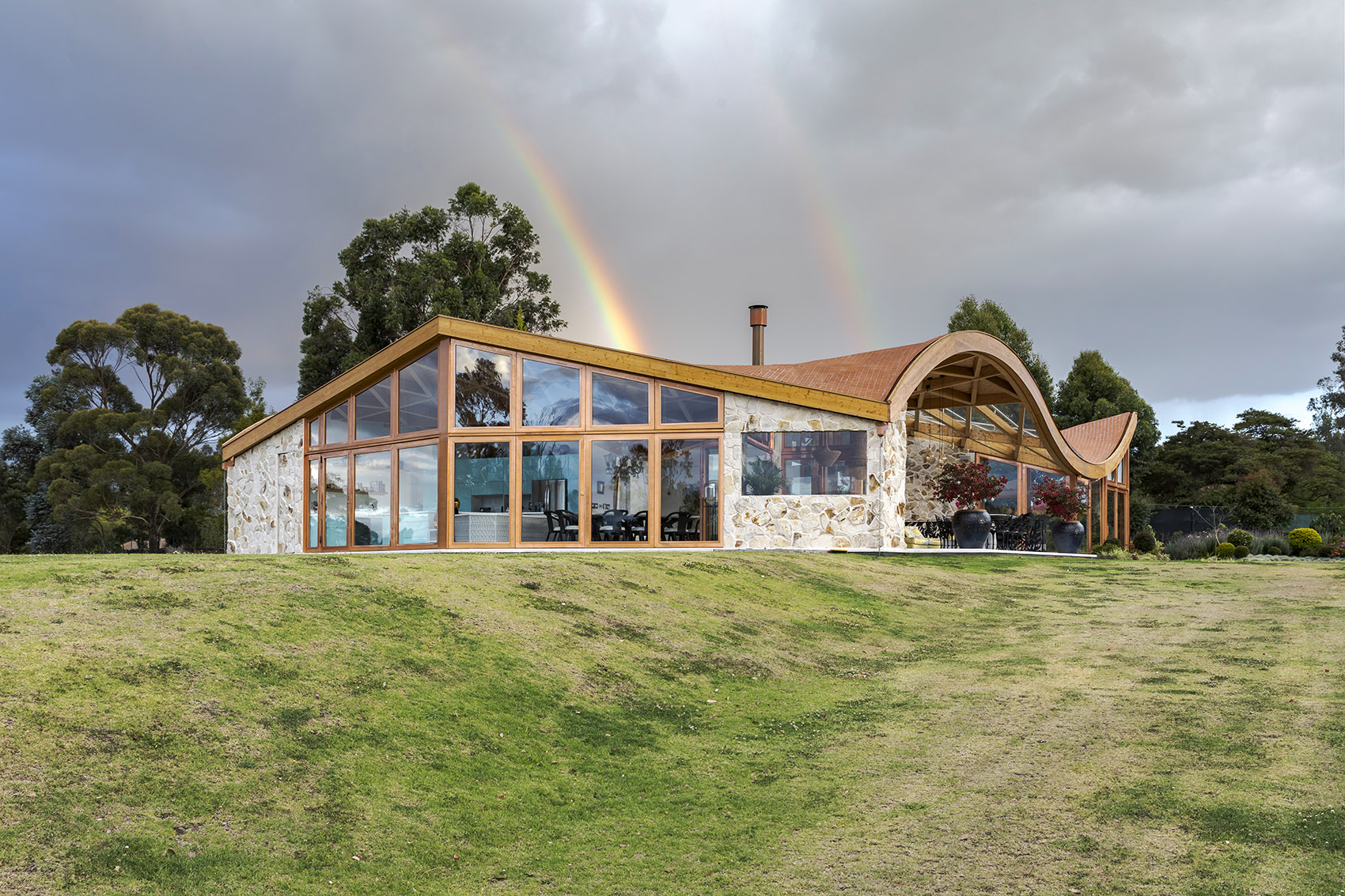 在形式和材料方面,设计追溯了庄园住宅的根源,以当代的建造手法重新诠释了木材、石材以及粘土等材料,为住宅赋予了轻盈通透的外观。在概念上,建筑师将住宅构想为一道“连续的波浪”,轻柔地覆盖并?;ぷ畔路降墓δ芸占?。