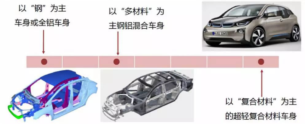 車用復(fù)合材料的發(fā)展結(jié)合了化工、機(jī)械制造和汽車復(fù)合材料設(shè)計等多學(xué)科的技術(shù),集中應(yīng)用在汽車底盤、車身覆蓋件和次結(jié)構(gòu)部件三個領(lǐng)域。其中碳纖維復(fù)合材料車身是最具顛覆性的輕量化路徑。
